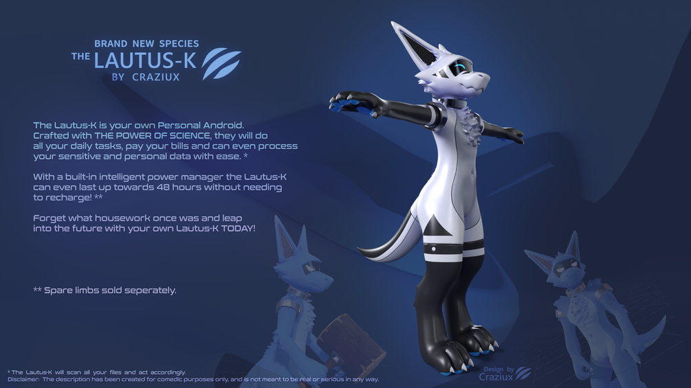 Disclaimer: The description has been created for comedic purposes only, and is not meant to be taken in a real or serious way. The version name: "Lautus-K169" (Example) is the number of .blend file backups I've gone through since I started sculpting the base from a UV sphere.